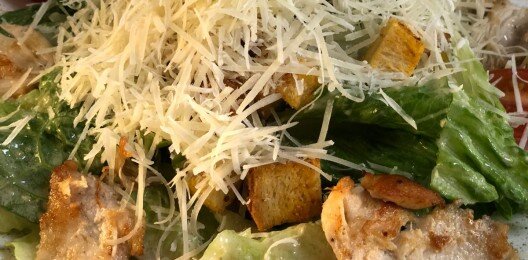 Краб, лист салата, помидоры черри, сухарики, сыр пармезан, соус цезарь