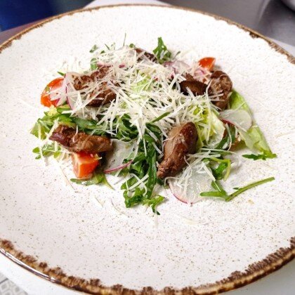 Зеленый салат с теплой куриной печенью