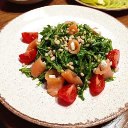 Руккола с лососем,с сыром рикотта и кедровым орехом